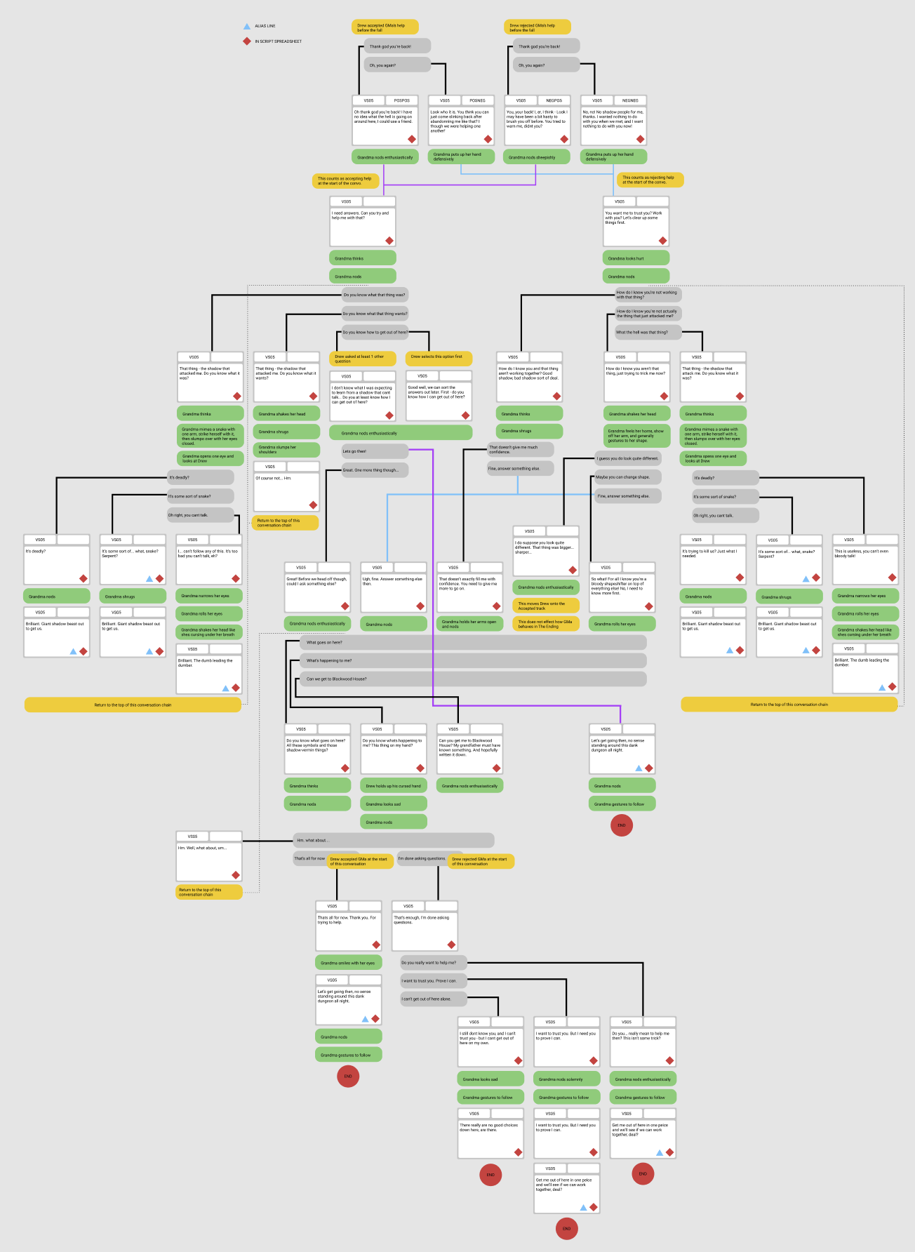 Every conversation was mapped out graphically, instead of just in text, to better denote the branches and additional information that had to be acounted for. We wanted to account for the kinds of questiosn players might have in the scene, and how much information was worth keeping hidden at any given time. Daily playtests enabled us to do small focus-groups with the team, letting members who werent assigned to a particular scene run through and raise questions they wihs had answers. Our iterative process would then allow us ot consider if those were worth adding back in, and reqriting the scene as needed.